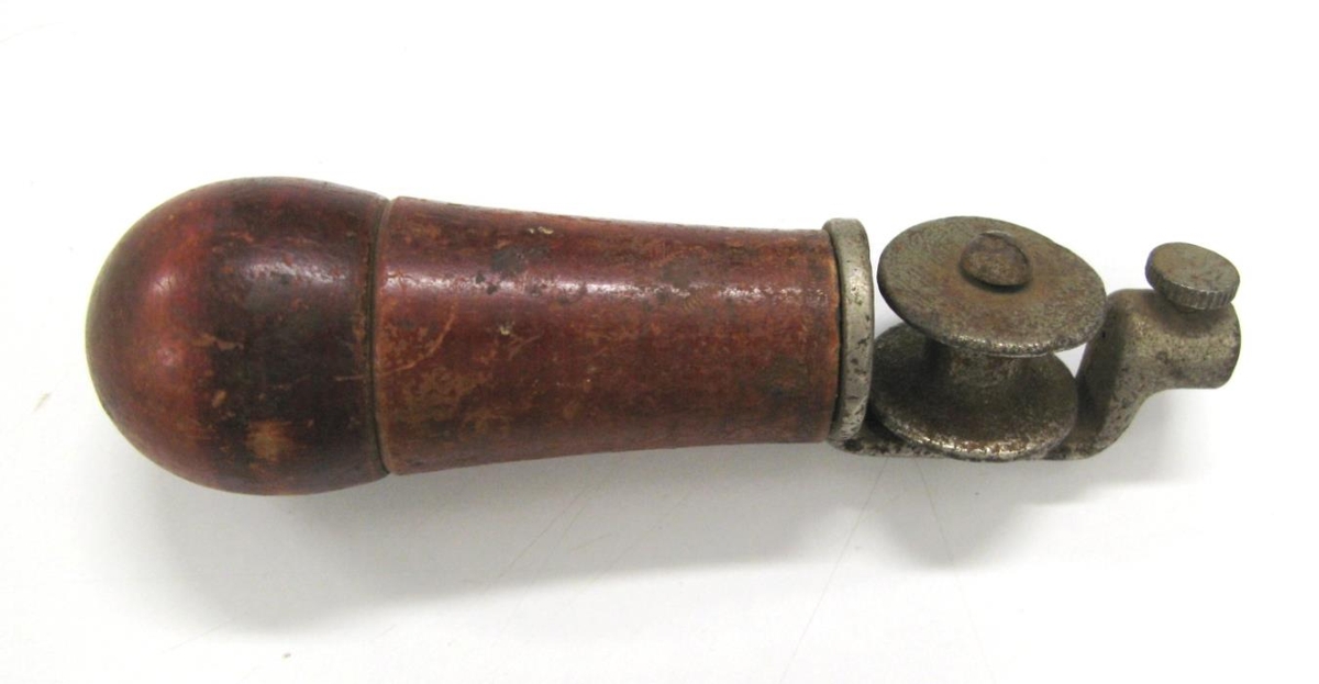Leðursaumaáhald. Trúlega pantað hingað til lands gegnum Importören. Notað til sauma en leðurnálina vantar. Gefið af Júlíusi Brynjólfssyni, bifreiðastjóra á Seyðisfirði 15.04.1979. Hirt úr rusli sem honum var falið að aka á haugana fyrir ýmsa gegn um árin.