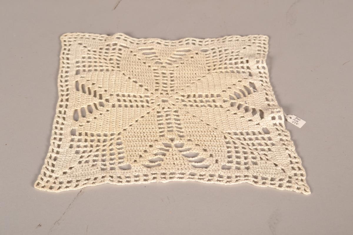 Heklaður ferningslaga dúkur úr bómullargarni m/hinu þekkta 8 arma stjörnuformi eða 8 arma rósarformi. Mjög vel farinn.