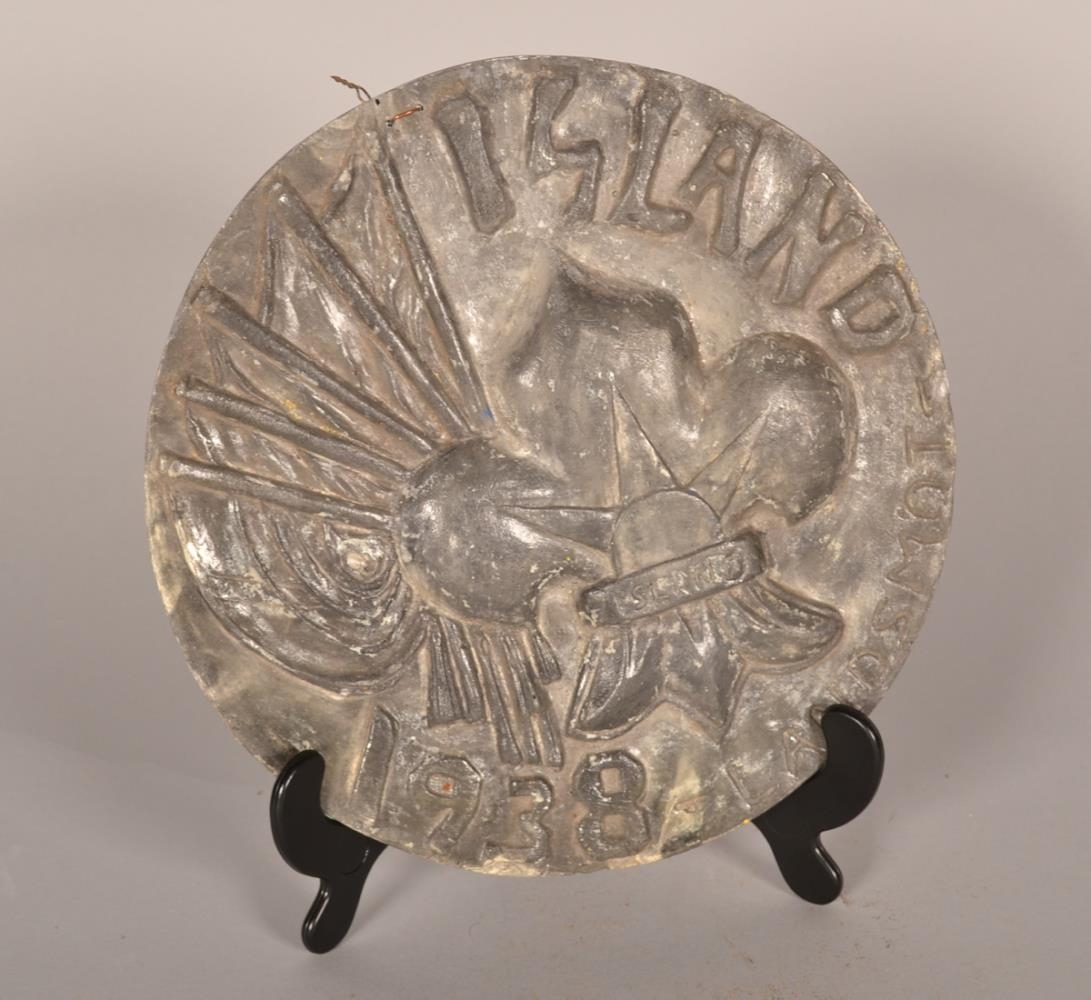Kringólttur platti merktur „Landsmót Ísland 1938“ með skátaliljunni, plattanum fylgir svart statíf