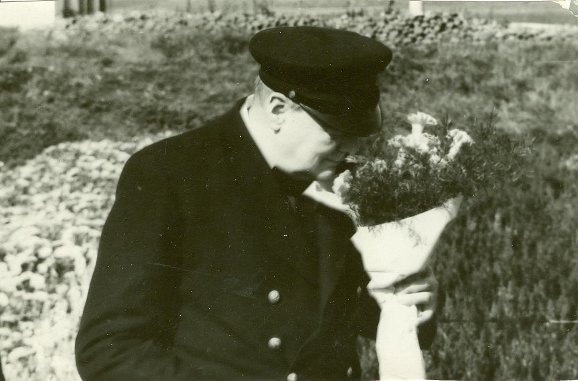 Karlmaður klæddur dökkum fötum og með kaskeiti á höfði. Heldur á blómvendi.