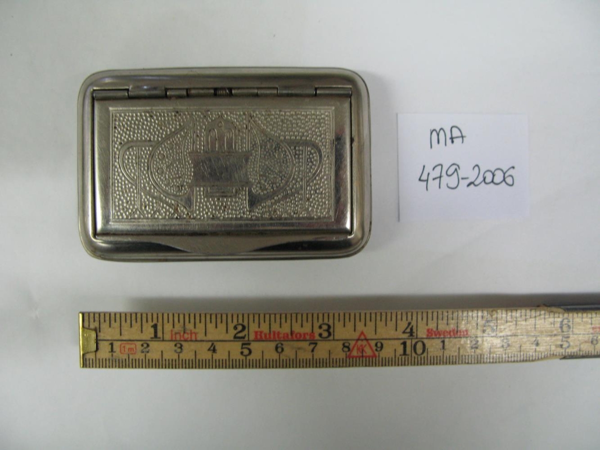 Tóbaksdós úr málmi. Ofan á loki eru arabísk höll. Í lokinu á dósinni er statív fyrir sígarettublöð.