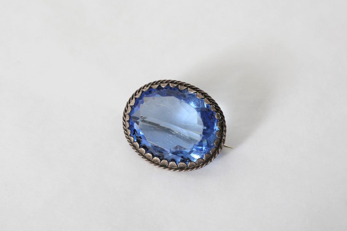 Brjóstnæla með bláum stórum, sporöskulöguðum steini með silfaðri umgjörð. Nælan er smíðuð af Birni Pálssyni á Refsstað.