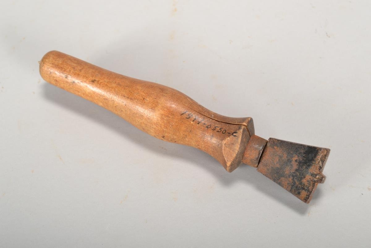 Glattjárn með viðarskafti. Var notað til að nudda leðrið og fá þannig eðlilegri áferð