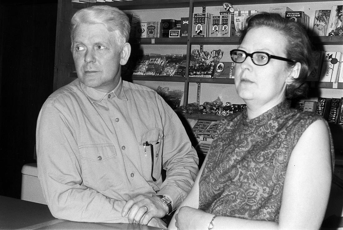 Vesturlandsferð, apríl 1969. Karlmaður og kona við búðarborð, sælgæti og tóbak á bakvið.