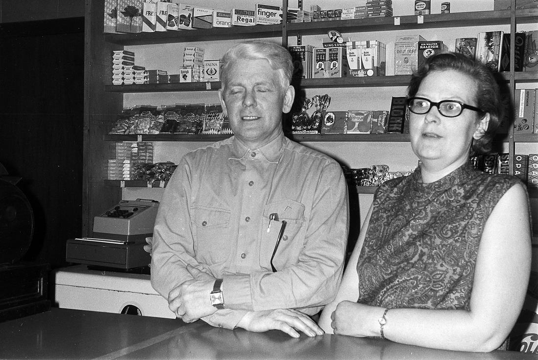 Vesturlandsferð, apríl 1969. Karlmaður og kona innan við búðarborð, sælgæti og tóbak í baksýn.