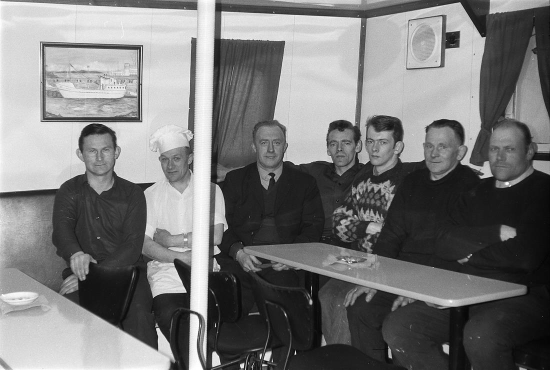 Vesturlandsferð, apríl 1969. Sjómenn sitja í matsal um borð í bát, einn með kokkahúfu.
