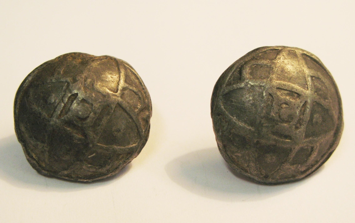Tveir gráir blýhnappar með upphleyptu rósaverki. Fundust á grundinni rétt fyrir utan brúna yfir Gilsá á Jökuldal. Þar blés upp hauskúpa, sem var orðin hvít og skinin þegar gefandi, Sigfús Sigvarðarson, sá hana fyrst 1922. Þá var löngu áður búið að finna hnappana sem geymdir voru hjá Ragnhildi Stefánsdóttir, konu Eiríks Sigfússonar bónda á Skjöldólfsstöðum á Jökuldal. Ragnhildur afhenti Sigfúsi hnappana 1936. Margsinnis var reynt að urða hauskúpuna ásamt ýmsum beinum, en hún blés alltaf upp. Vorið 1936 man Sigfús síðast eftir að hafa séð hana. Minnti Sigfús sem skarð væri í höfuðbeininu ofan við hægri augntótt.