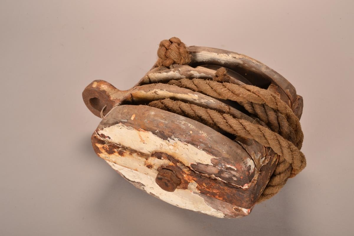 Þrískornar tréblökk. Gætu verið samstæðar með 1983-7-2 í talíu. Hjólásar úr járni og liggja í járnbaulum