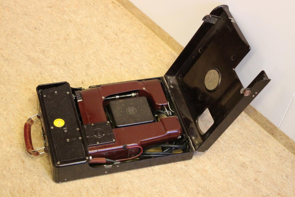 Ferðasaumavél teg. Fischer Mewa, framleidd í A-Þýskalandi. Saumavélin er í brúnum málmkassa 30 x 40 x 8.5 cm, sem jafnframt er borð.