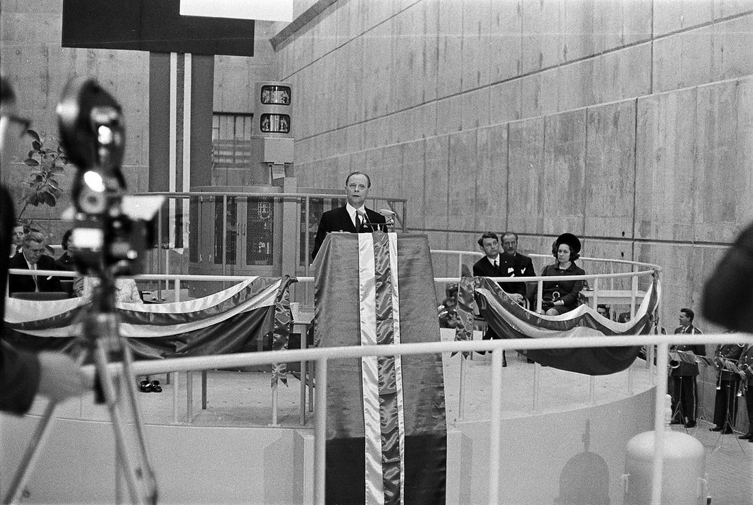 Árnessýsla, vígsla Búrfellsvirkjunar, maí 1970. Kristján Eldjárn forseti í ræðustól, Geir Hallgrímsson og Jóhann Hafstein vinstramegin en Jóhannes Nordal til hægri.