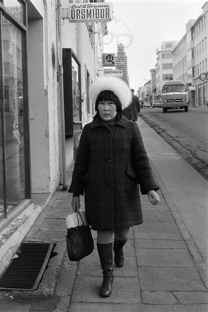 Skólavörðustígur, mars 1970. Kona á gangi úti á götu.