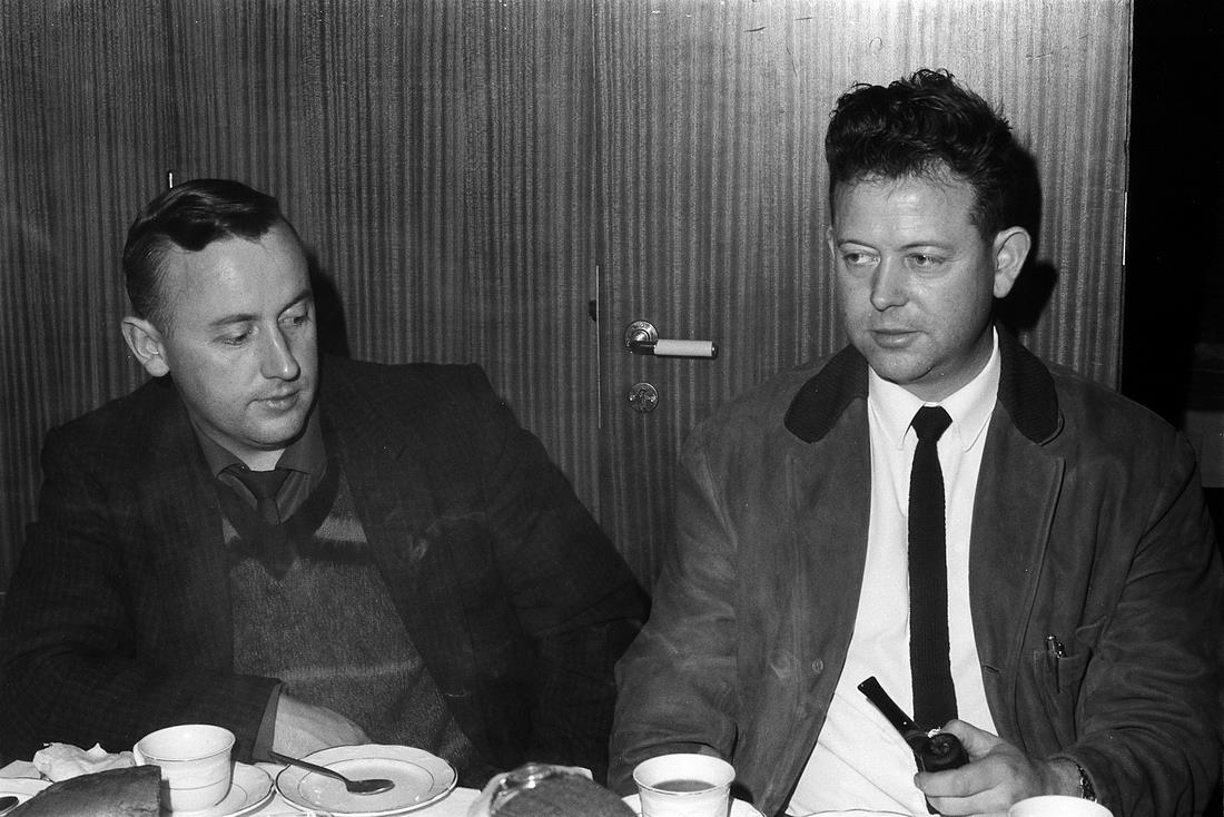 Rangárvallasýsla. Vatnsveita Land og ....(?) okt. 1967. Tveir karlmenn sitja til borðs. Kaffi og kökur.