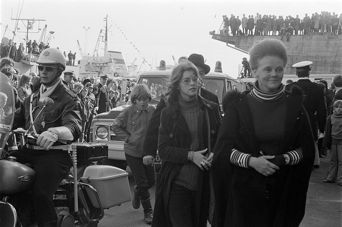 Handritin heim 21. apríl 1971. Mannfjöldi á bryggju, lögregla á mótorhjóli.