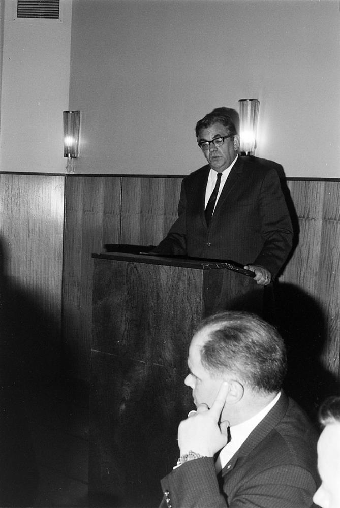 Rangárvallasýsla. Vatnsveita Land og ....(?) okt. 1967. Karlmaður flytur ræðu. Björn Fr. Björnsson sýslumaður