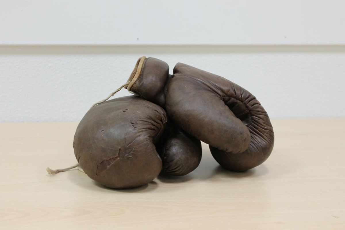 Bjarni æfði hnefaleika og knattspyrnu með KR. Boxhanskarnir urðu leikföng barna og barnabarna.