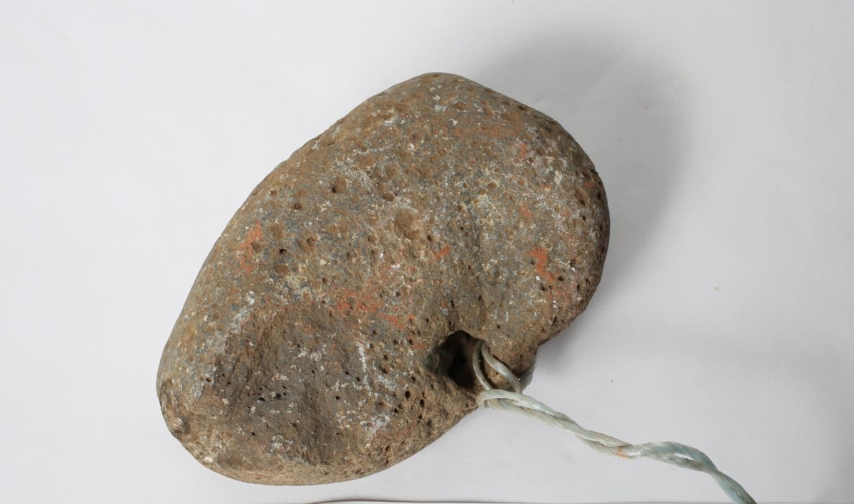 Grár steinn með gati og band þar í. Á skellihurð. Fannst í rústum á Giljum.