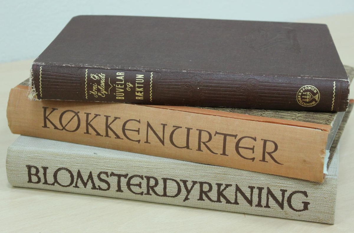 Garðyrkjubækur: Dyrkning af kökkenurter på friland og under glas, eftir Tönnes Bacher og Frode Sörensen, fyrir 1950. Blomsterdyrkning under glas, de vigtigste handelskulturer, håndbog for gartnere, eftir H.K. Paluda, T. Bacher, 1944. Jordbrugs- og gödningslære, eftir Lars Hansen. Búvélar og ræktun, eftir Árna G. Eylands, 1950.