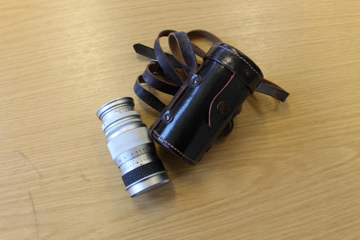 Aðdráttarlinsa: Ernst Leitz GmbH, Wetzlar. Elmar f=9 cm 1:4, nr.1464322. Sér ekki á henni er í brúnu leðurhulstri, lokið laust frá límt til bráðabirgða.