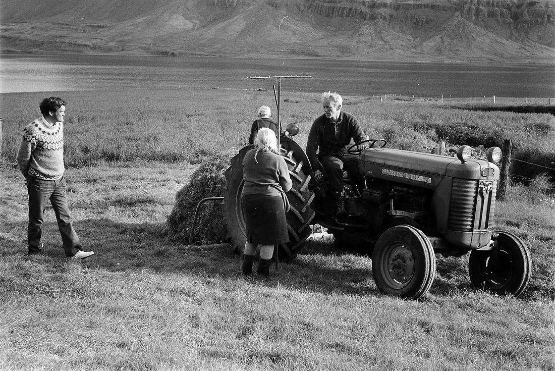 „Árni Björnsson stendur í lopapeysunni, Nanna Guðmundsdóttir heldur á hrífu, Bragi Gunnlaugsson á dráttarvélinni. Myndin er tekin á bænum Berufirði við Berufjörð á Austfjörðum. Nanna Guðmundsdóttir, afasystir mín var fædd 18. sept. 1906 - og dó 14. mars 1988. Bragi Gunnlaugsson, föðurbróðir minn, var fæddur 29. apríl 1932 og dáinn 8. apríl 2018. Nanna var m.a. kennari og sá um bókasafnið í hreppnum, ógift og barnlaus og bjó alltaf í Berufirði. Nönnusafn stofnað að undirlagi hennar. Bragi var einnig ókvæntur og barnlaus en bjó alla ævi sem bóndi í Berufirði.“ (HE 2024)