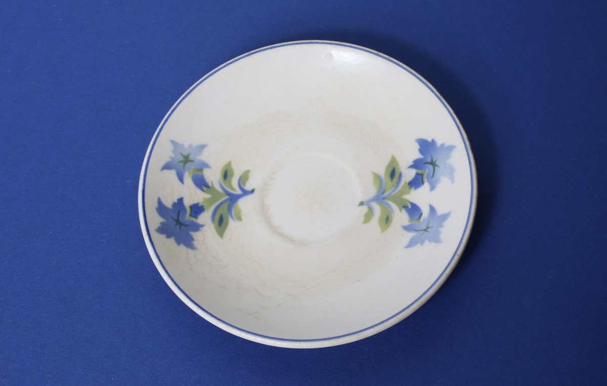 Hvít undirskál með bláum rósum og blárri rönd efst. Frá Giljum.