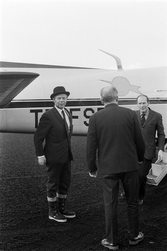 Vestmannaeyjagosið 1973, fyrsta nóttin. Kristján Eldjárn, Magnús H. Magnússon og óþekktur karlmaður standa fyrir framan flugvél.