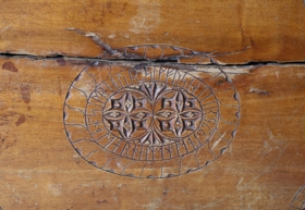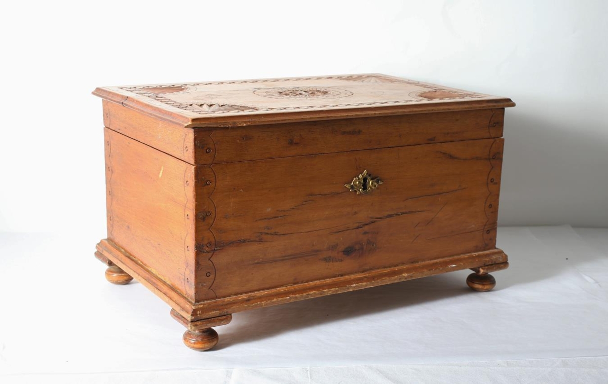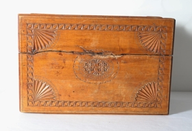 Fætur renndir. Útskornir á loki með skrautbandi umhverfis og riffluðu mynstri í miðju loki. Sporöskjulaga útskurður með nafni Sigríðar Sigfúsdóttur og ártalinu 1925 með rúnaletri. Strikað skraut á hornum. Gyllt skráarlauf, lykill fylgir ekki. Járnnegldur. Stór sprunga eftir endilöngu. Kistilinn gerði Halldór Guttormsson.