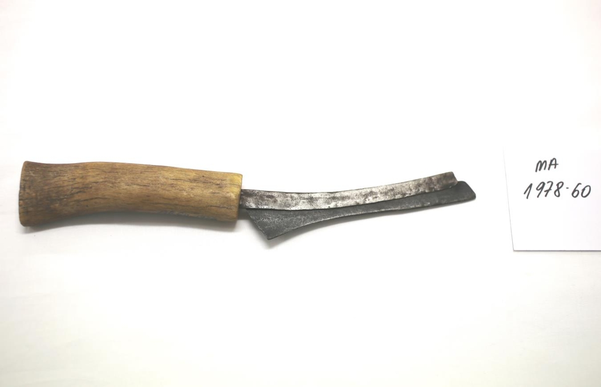 Skaft úr hreindýrshorni. Blaðið er mjög slitið ljáblað (bakkaljár). Til ýmissa nota. Smíðað af gefanda.