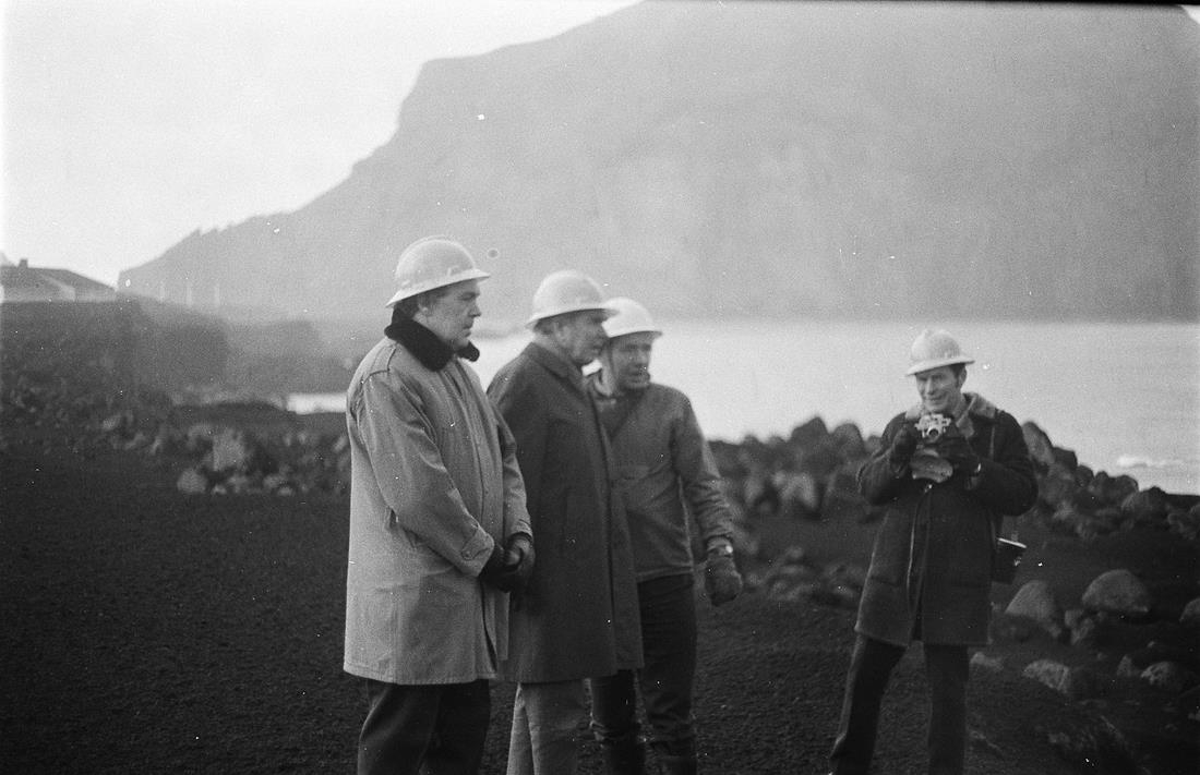 Vestmannaeyjagos, fyrstu dagar og nætur. Alþingismennirnir Magnús Kjartansson og Hannibal Valdimarsson á samt tveimur öðrum standa niður við sjó í hraungjalli.