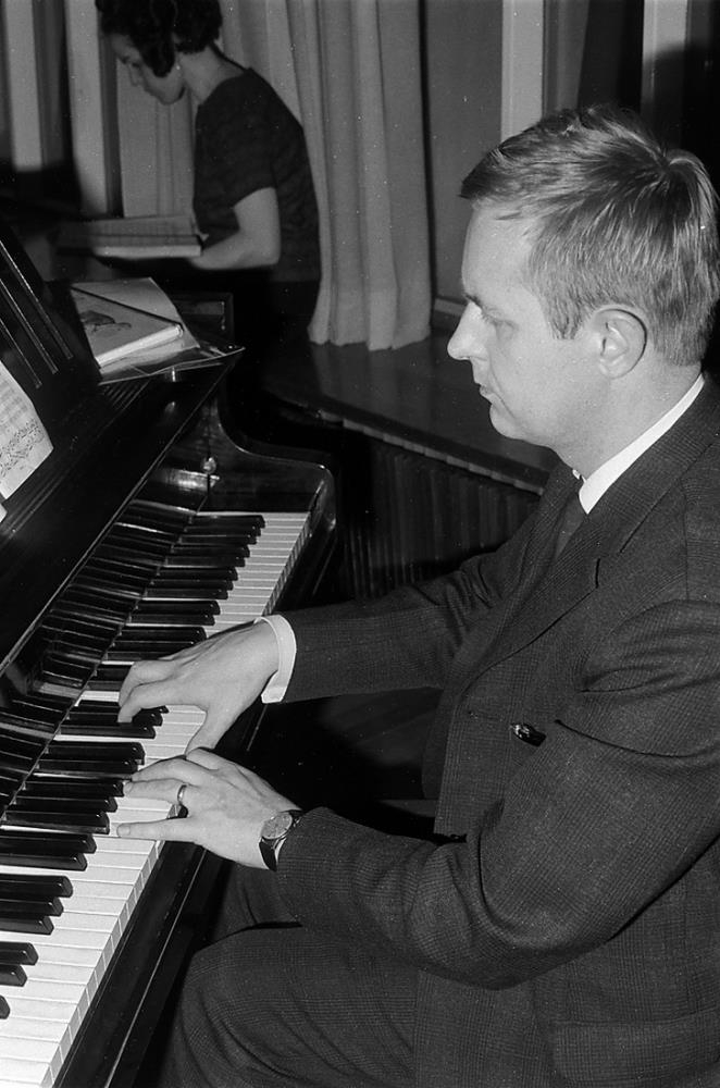 Hagatorg. Melaskóli. Æfing Fílharmóníunnar, vetur 1968. Kóræfing. Karlmaður spilar á píanó.