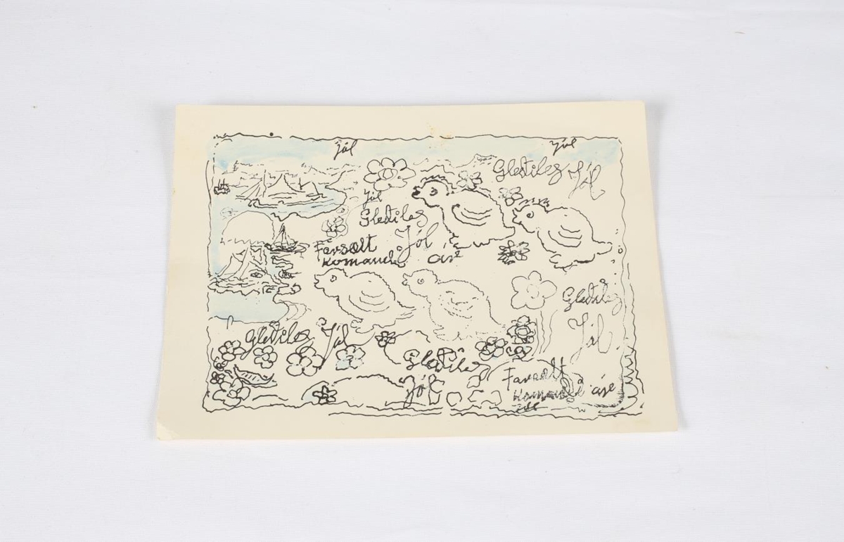 Kort/spjald, einfalt með tússteikningu sem er líklega eftir meistara Kjarval. Myndin er eins og útlínur landslags ásamt svolitlum sjó í efra horni öðrum megin og meðfram efra kanti, og er þetta með daufum bláum tón. Á sjónum eru tvö seglskip. Á landi eru fjórir undarlegir fuglar, e.t.v. af hænsnfuglaætt. Stór einföld blóm hér og þar og stendur líka hér og þar "Gleðileg jól", "jól" og "Farsælt komandi ár".