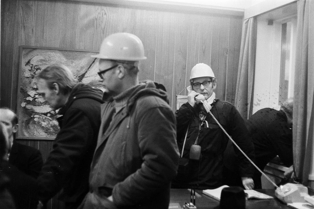 Vestmannaeyjagos, fyrstu dagarnir, fyrsta nóttin. Karlmenn inni á skrifstofu með hjálma, Hjálmar R. Bárðarson og Sigurður Þórarinsson, talar í síma.