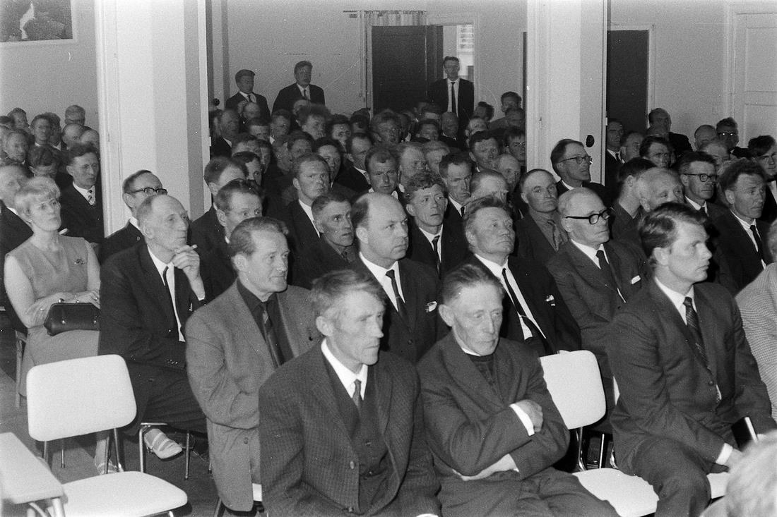 Bændafundur um ket (?). Reykjaskóla, Hrútafirði, júlí 1968. Fundargestir sitja og hlusta. Þarna eru (t.f.v.)