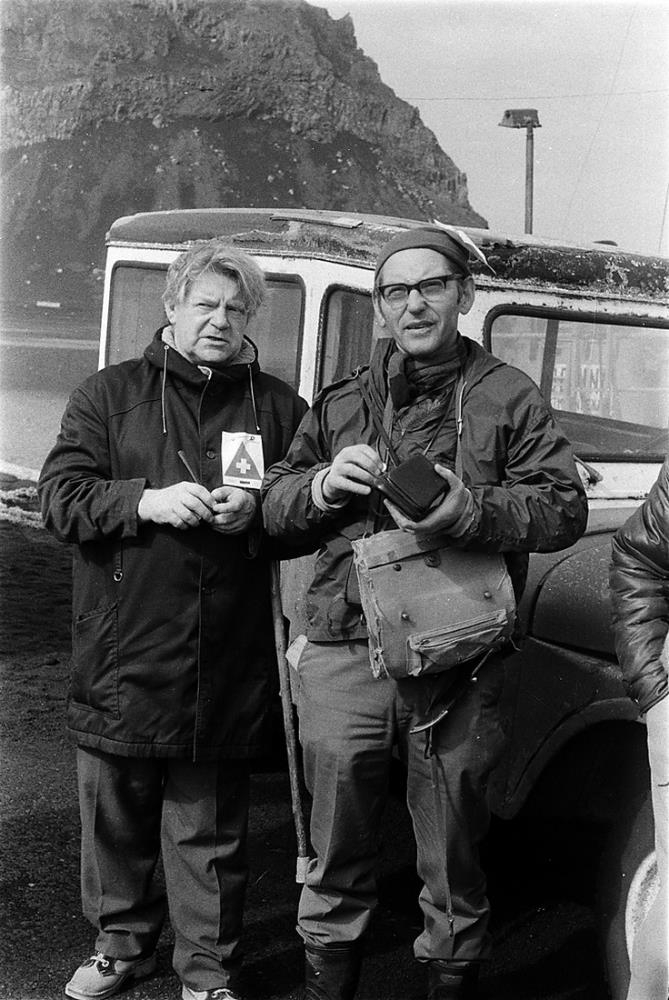 Vestmannaeyjar - mars 1973. Sigurður Þórarinsson og annar karlmaður standa við jeppa.