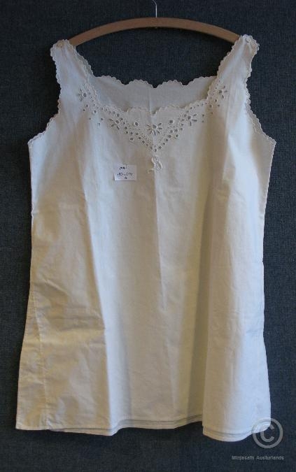 Hvítur undirkjóll, útsaumaður með hvítsaumi kringum hálsmál og í handvegi og "H" framan á. Úr eigu Helgu Þormar (f.1889) frá Geitagerði í Fljótsdal. Helga var tengdamóðir gefanda.