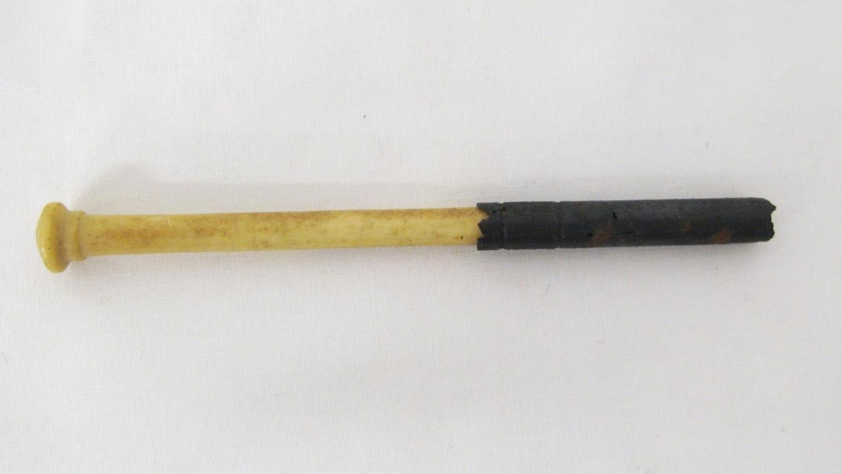 Hvít pennastöng, líklega úr hreindýrshorni eða hrosslegg, rennd með járnhólk á endanum. Stöngina átti Sigfús Sigfússon, bóndi Skjögrastöðum sem sjálfur smíðaði hana.
