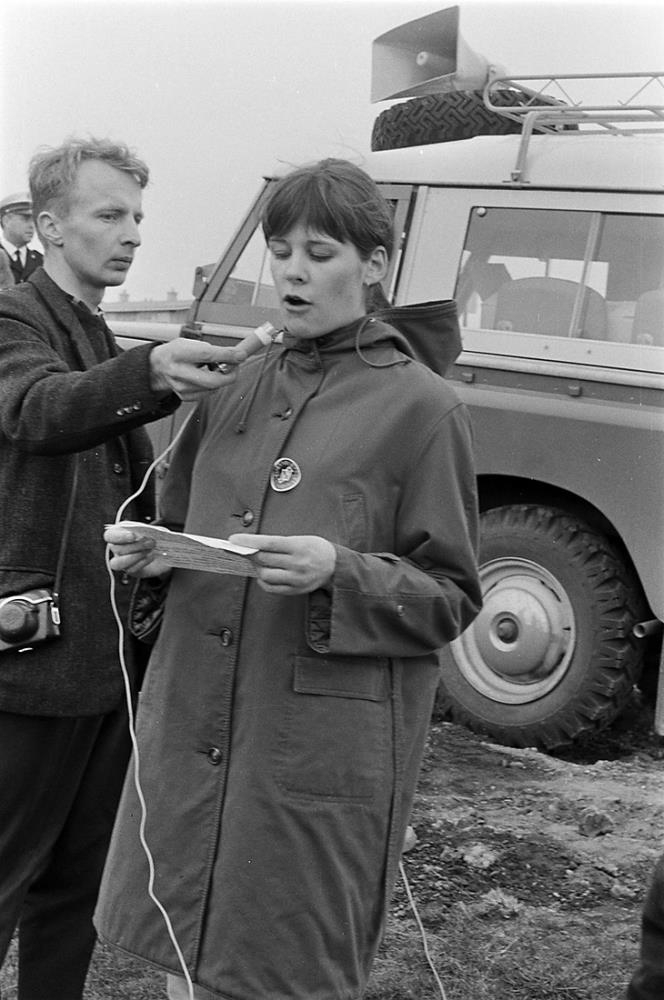 Úr Keflavíkurgöngu. Upphaf göngu og útifundur við Miðbæjarskóla, 23. júní 1968. Blaðamaður tekur viðtal við konu.
