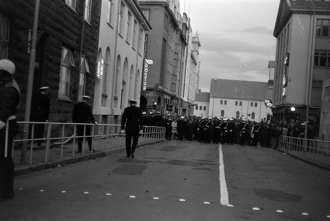 Ólæti Nató-unglinga eftir útifund hernámsandstæðinga 23. júní 1968. Gata, hús. Lögregla og fólk.