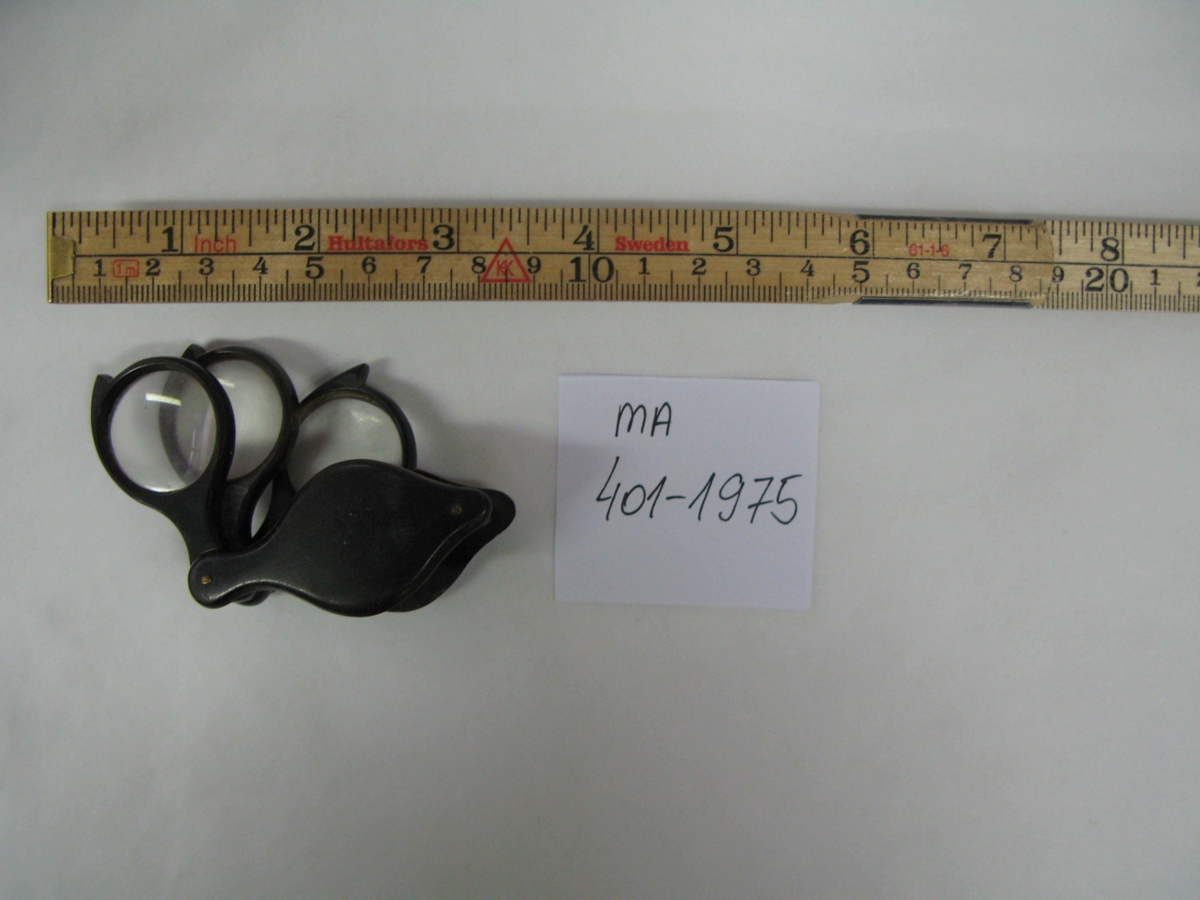 Þrjú stækkunargler saman, smellt inn í eins konar hulstur úr plasti.
