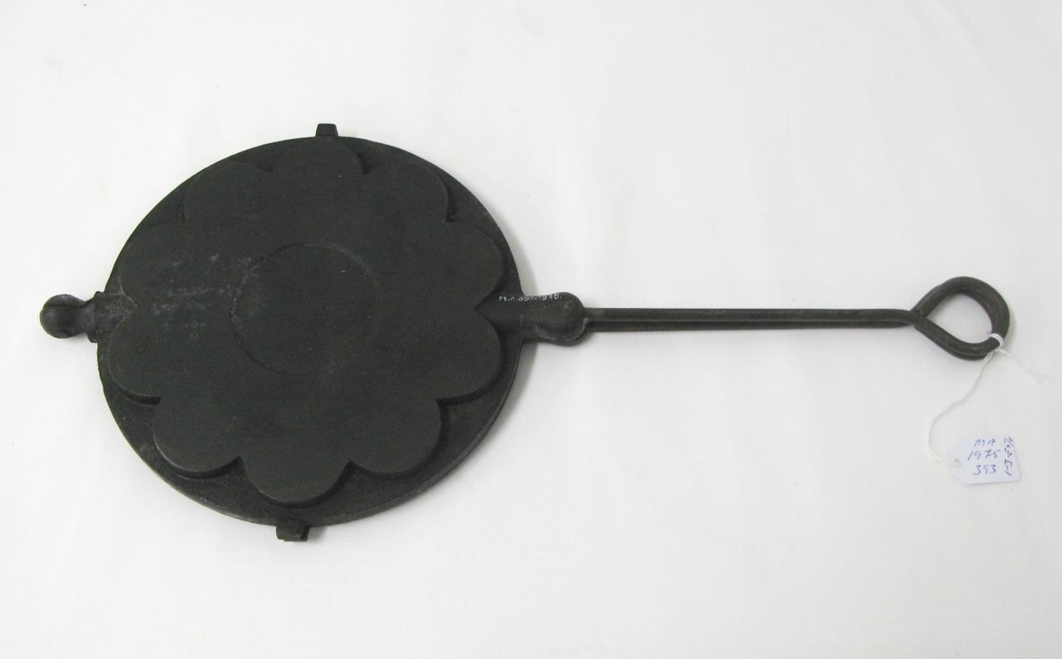 Vöfflujárn frá gljákolavél. Tegund: Husquarna. Járnhöld sem enda í lykkju. Mjög þungt.