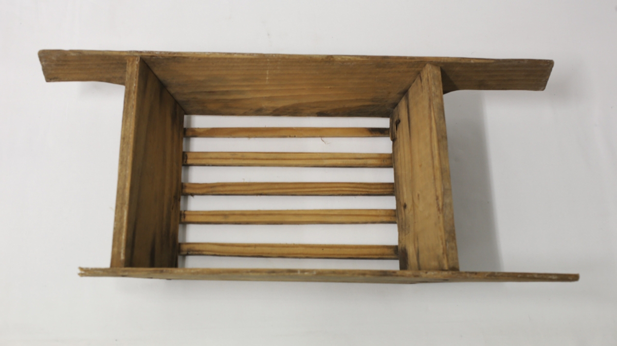 Skyrgrind sem er frekar lítil og nett, með fimm rimlum í botninn og hliðarhaldirnar ganga nokkuð langt út frá grindinni. Annað haldið á kjálkanum er brotið. Smíðuð af Eiríki Einarssyni.