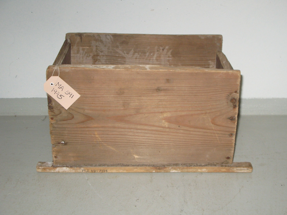 Mjölsigti, ferkantaður trékassi með vírneti í botninum, annar endinn á haldinu er brotinn en einnig er brotið úr efri brúninni. Úr búi Einars Eiríkssonar, föður gefanda.