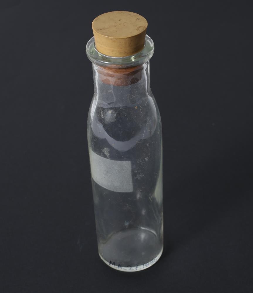 Glerpeli með gúmmítappa. Líklega prufuglas fyrir mjólkurprufur.