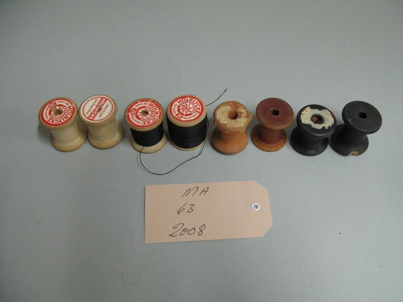 Átta stykki tré-tvinnakefli. Fjögur stykki merkt: "Mölnlycke 200 yards 36 Basta Bomull". Tvö þeirra eru með svartan þráð. Tvö kefli eru svört og mis há, tvö brún sem eru ekki með þræði á. Samkvæmt gefanda voru þau geymd í efstu skúffu ásamt öðru smádóti í kommóðu sem Jón Björnsson, bónd á Hofi 1, Fellum, átti.