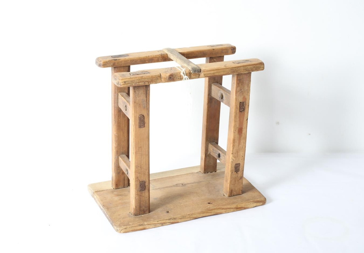 Nettur snældustóll sem er fyrir tvær spólur en það er engin teinn í honum. Það hefur verið gert við undirstöðuplötuna og sett þverspýta uppi til að tengja uppistandana. Virðist vera gamall. Úr búi Jarþrúðar Einarsdóttur frá Skeggjastöðum.