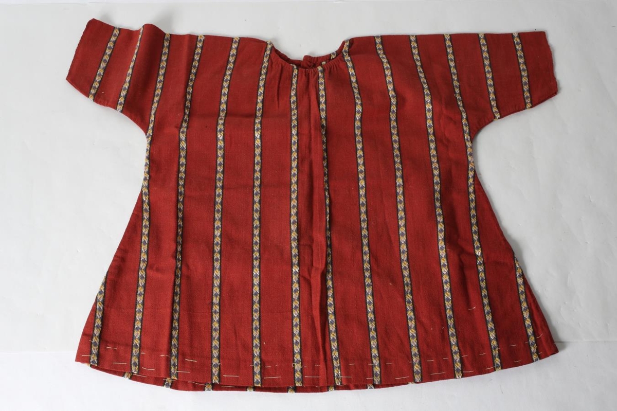 Rauður, hvítur og blár barnakjóll, ekki fullsaumaður. Bolur og ermar ganga út í eitt, röndóttur. Soffía Elíasdóttir, föðursystir gefanda saumaði kjólinn á dóttur sína sem dó á afmælisdaginn sinn þann 1. júní 1923, aðeins tveggja ára gömul. Líklega hefir Soffía verið að sauma kjólinn þegar hún dó því hann er ekki fullfrágenginn. Soffía var kona Vigfúsar Sigurðssonar frá Egilsstöðum í Fljótsdal.