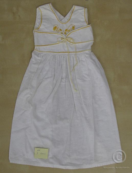 Hvítur bómullarkjóll m/ gulum útsaumi, opinn að aftan og bundinn saman að framan. Útsaumuð mynd á bol. Saumaður af Stefánný fyrir 1946 fyrir fæðingu elstu dóttur hennar, Elsu Þorbjargar Árnadóttur. Var síðan notaður á öll fjögur börn gefanda. Gefendur bjuggu þá í Húsey í Hróarstungu.