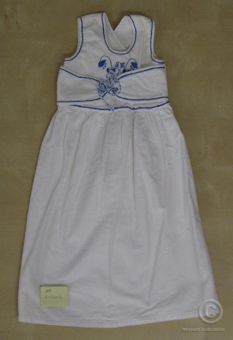 Hvítur bómullarkjóll m/ bláum útsaumi. Opinn að aftan, bundinn saman að framan. Útsaumuð mynd á bol. Saumað af Stefánný fyrir 1946 fyrir fæðingu elstu dóttur hennar, Elsu Þorbjargar Árnadóttur. Var notað á öll fjögur börn gefanda. Gefendur bjuggu þá í Húsey.
