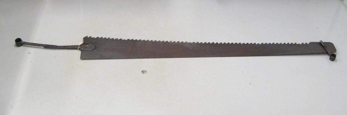 Stórviðarsög sem vantar bæði tréhöldin á en festingar eru á báðum endum. Það hafa líklega brotnað fimm tennur.