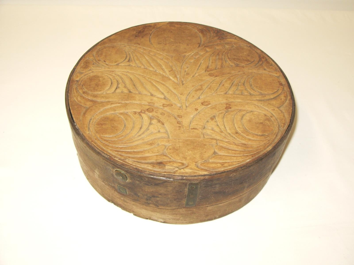 Trafaskja/ostadallur. Íslensk smíði. Smíðaður úr spón, en botn og lok úr heilum viði, lokið útskorið rósaverki. Spónninn festur saman með eirnöglum. Annað hvort trafaaskja eða osta/smjördallur. Úr búi Þórunnar Hallsdóttur, húsfreyju á Litla-Steinsvaði (f. 20.11.1873, d.05.05.1947), systur Björns á Rangá.