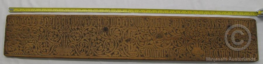 Á fjölinni er mikill útskurður, rósaflúr og letur. Í miðju er skorið fangamarkið "E.E." Á efra borði er bókstafsbekkur, en aðeins fyrsti stafur hvers vísuorðs er skorinn. Þ.e. "(Blessaðu Drottinn bæ og lýð,/ blessa þú oss á hverri tíð./ Blessan þína oss breiddu á./ Blessuð veri oss hvíldin þá. Amen". Á neðra borði til hægri handar stendur: "Þann 7. apríl MCCMLIV" (=1854). "B.B.S."). Fyrra fangamarkið á við eiganda fjalarinnar, Eirík Eiríksson (1832-1903), bónda á Vífilsstöðum og Dagverðargerði, góðvinar Páls Ólafssonar. Síðara fangamarkið á við smiðinn Björn Skúlason, ágætan útskurðarmann og skrifara. Hvernig fjölin komst í eigu gefanda er ekki lengur vitað.